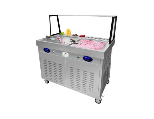 Máquina de helado frito con 2 planchas de 50 x 50 cm y 7 confiteras refrigeradas. Ofrece alta potencia de 2400 W y doble compresor de 1.5 HP, garantizando un congelado rápido entre -10 °C y -30 °C. Fabricada en acero inoxidable con panel digital y sistema de defrost por pedal y botón, ideal para negocios de postres y helados artesanales.